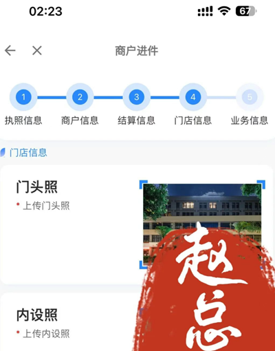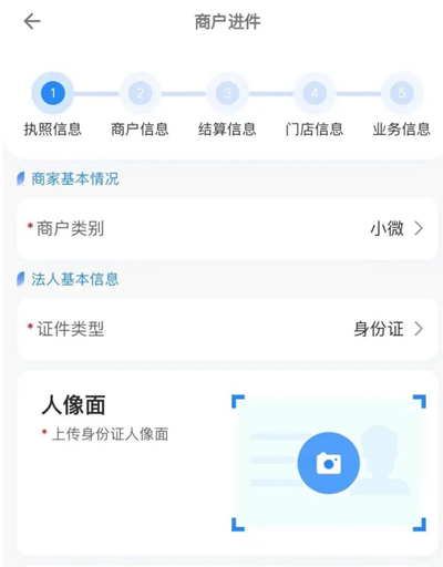 3、商户进件,分别填写执照信息、商户信息、结算信息、门头信息,上传注册人的身份证信息。