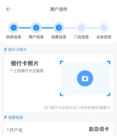 对私非法人结算所需资料:营业执照照片、法人身份证正反面照片、法人手机号码,银行卡正反面照片,结算人身份证正反面照片,手持“资金委托结算授权书”照片,银行预留手机号码、银行卡开户行、门头照、店内照、收银台照;