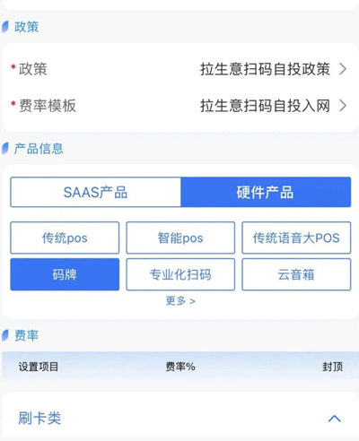 (3)填写商户类别-也就是MCC,选择店铺对应行业即可;教培类、医美类、停车场及电商商城类商户需选择指定行业类型,对应商户类型费率不低于0.6%入网。