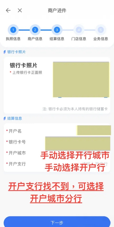 填写收款信息-上传银行卡照片并填写好开户行城市/支行,支行找不到的、可选择开户城市的分行;