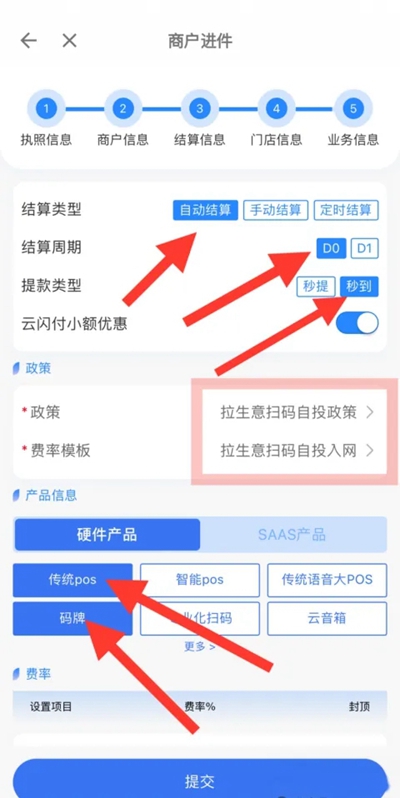 7、再选择商户结算费率及隔日到账或者秒到。如果选择隔日到账,选择D1及单选码牌若选择秒到账,选择D0及双选码牌和智能pos。