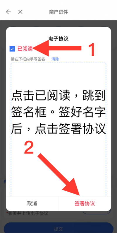 (3)电子协议-勾选“已阅读”并正楷签名并点击“签署协议”,最后点“提交”按钮。