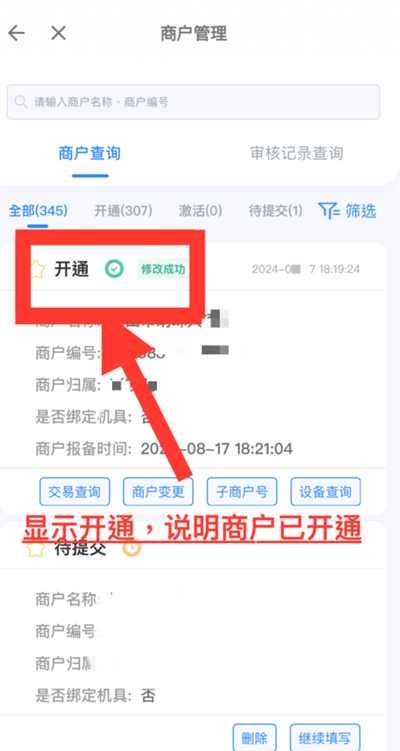 (6)商户查询界面显示“开通”,说明商户入网成功,完成商户注册,下一步,下载拉卡拉数字钱包操作。