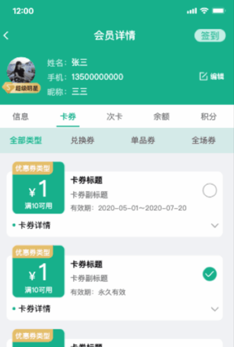 会员单品券、全场券、礼品兑换券、次卡秒核销;此外,还支持微信微信pay券功能。