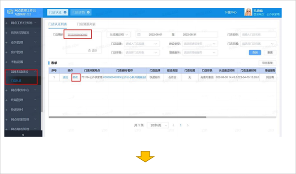 (1)神州系统—管理工作台—D网末端建设—门店认证—修改—门店寄件掌中通账号(填写需要更换的业务员掌中通账号)。