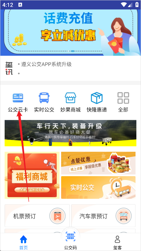 1、打开遵义公交App,在首页界面中找到并点击“云卡”入口。