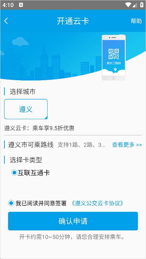选择卡类型(如本地卡或互联互通卡),并点击“申请开通”。