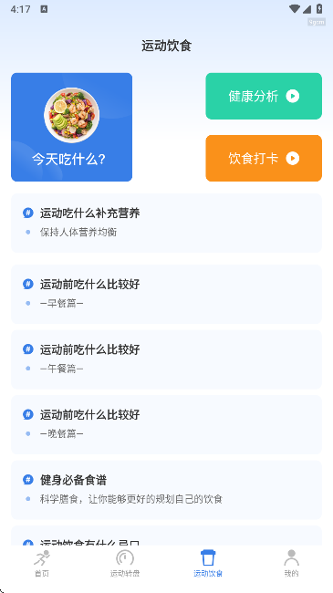 计步锻炼,运动记录;运动转盘,帮你抉择;饮食打卡,维持身体健康;运动饮食,保持营养均衡。