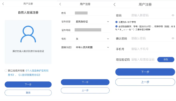 3、进入“用户注册”界面,勾选同意后,点击【下一步】,输入姓名、证件类型、证件号码、性别、国籍(地区)信息,点击【下一步】,按照要求设置密码,输入手机号,点击【下一步】进入人脸识别界面。