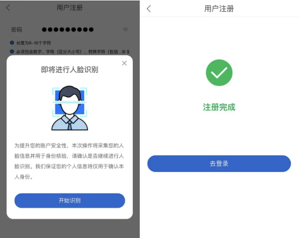 4、点击【开始识别】进行人脸识别,识别完成即注册完成,可直接在APP上登录办理相关业务,也可在“北京税务服务号”微信公众号中登录进入办理相关业务。