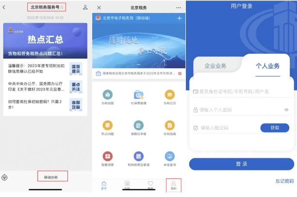 微信搜索公众号“北京税务服务号”,点击【移动办税】,进入“北京市电子税务局(移动端)”界面,点击【我的】,选择【个人办税】,录入手机号或用户名,填写密码、验证码等信息,点击【登录】。