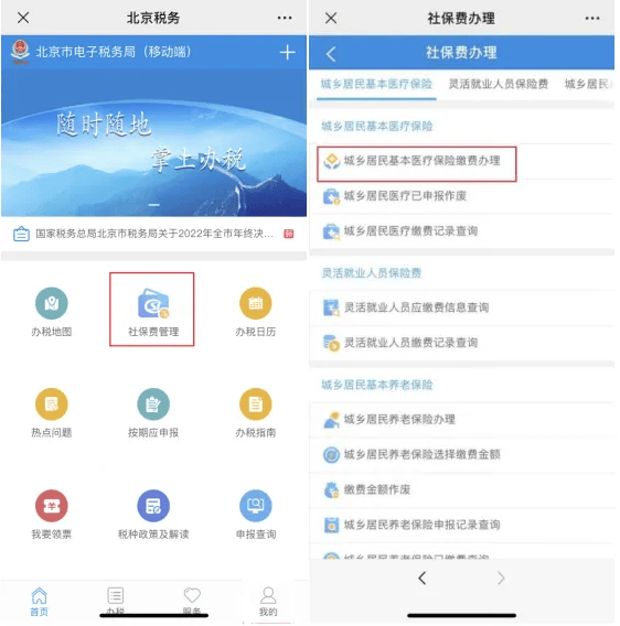 1、在“北京市电子税务局(移动端)”首页,点击【社保费管理】。点击【城乡居民基本医疗保险缴费办理】进入操作界面。