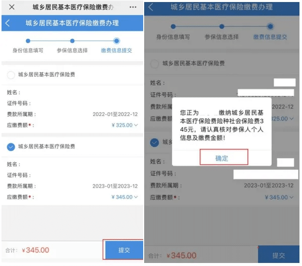 3、在“缴费信息提交”界面,勾选对应缴费信息,点击【提交】,弹出确认对话框,确认缴费险种、金额无误后,点击【确定】。