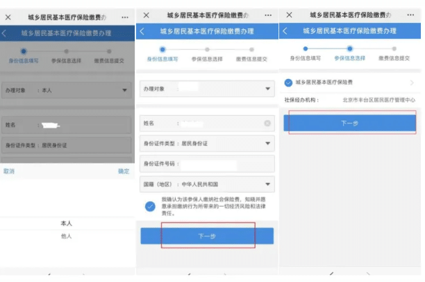 2、“办理对象”可以选择为本人或他人办理缴费。选择“本人”界面会自动带出本人身份信息;选择“他人”需要手动录入他人身份信息。确认身份信息是否正确,点击【下一步】按钮,会自动跳转到“参保信息选择”界面。(若点击【下一步】提示“没有您的参保信息”请咨询人社(医保)部门。)