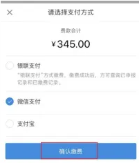 4、点击【提交】跳转到“选择支付方式”界面,可以通过支付宝、微信、银联支付等方式进行缴费,选择支付方式后点击【确认缴费】完成缴费。