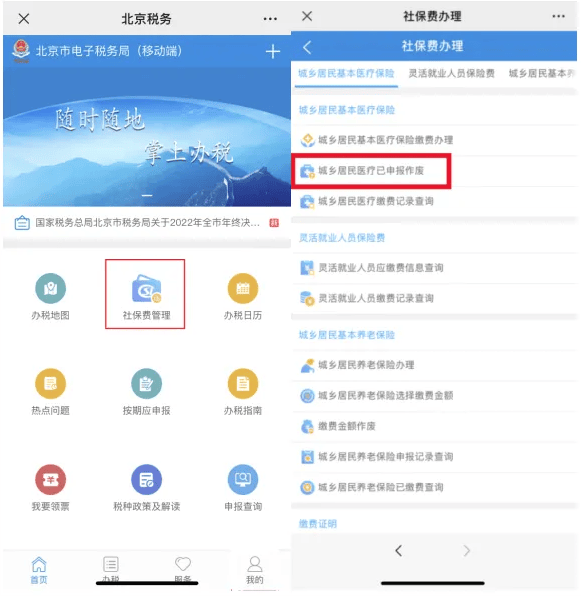 1、在“北京市电子税务局(移动端)”首页,点击【社保费管理】。点击【城乡居民医疗已申报作废】进入操作界面。
