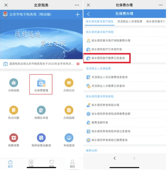 1、在“北京市电子税务局(移动端)”首页,点击【社保费管理】。点击【城乡居民医疗缴费记录查询】进入操作界面。
