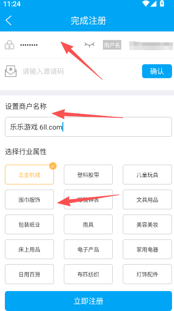 2、设置用户密码、商户名称并选定行业,之后点击立即注册。
