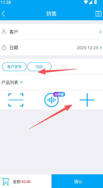 4、在销售页面选定采购详情,在此添加产品,完成后点击确认完成订单销售采购。