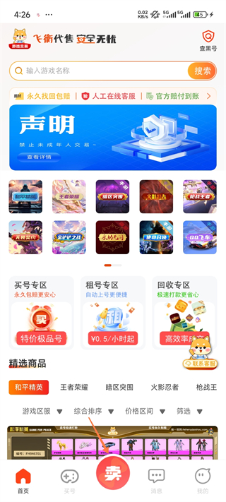 飞衡代售app是一款专门为喜欢玩游戏的玩家朋友打造的账号交易平台,在这个平台上面也是带来了全面的账号交易服务,广大用户朋友是能够浏览到众多的游戏内容,以及丰富的游戏账号,随时都是可以浏览详情购买,有需要的朋友现在就来下载使用吧!