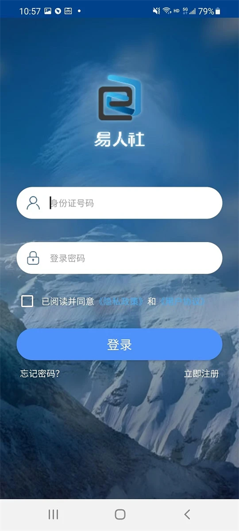 2、首次使用需要点击登录页面右下角“立即注册”,依次输入姓名、身份证号、密码、手机号(两遍),并勾选《易人社手机APP用户条款》完成用户注册(已注册人员跳过第二步);