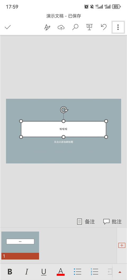 3、创建后先点演示文稿的文字部分,之后再往里面加内容,和平时在电脑上使用一样,一步步严格来。