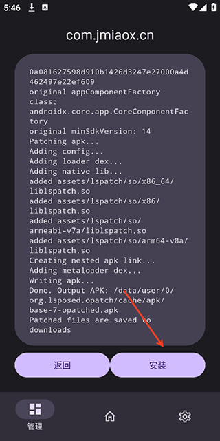 注入完成后,OPatch会生成新的APK文件。点击“安装”按钮,或通过手机文件管理器找到注入后的APK手动安装。