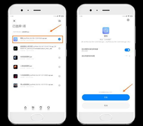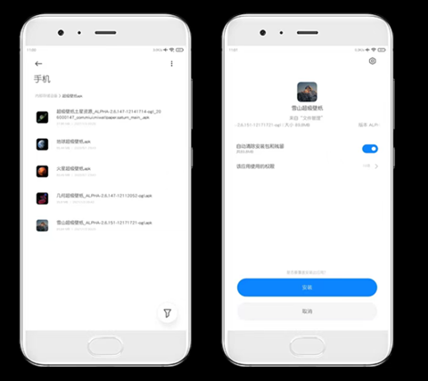 2、接下来,下载5个超级壁纸安装包,从MIUI的【文件管理器】选择喜欢的一个安装包,点击安装即可。比如,目前新出来的“24时雪山超级壁纸”,其APP版本号为“ALPHA-2.6.151-12171721-ogl”,如下图所示: