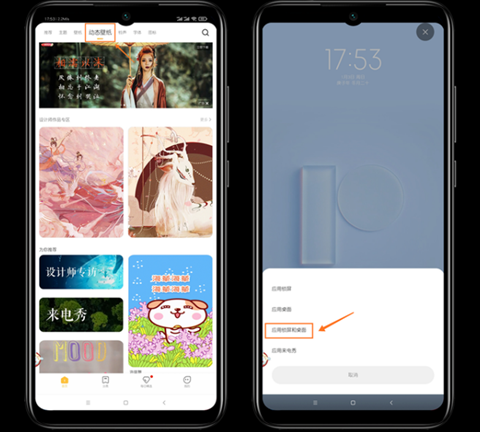 2)打开MIUI 桌面的【小米主题】,选择【动态】壁纸那栏,随便选择一个动态图,应用【锁屏】和【桌面】;