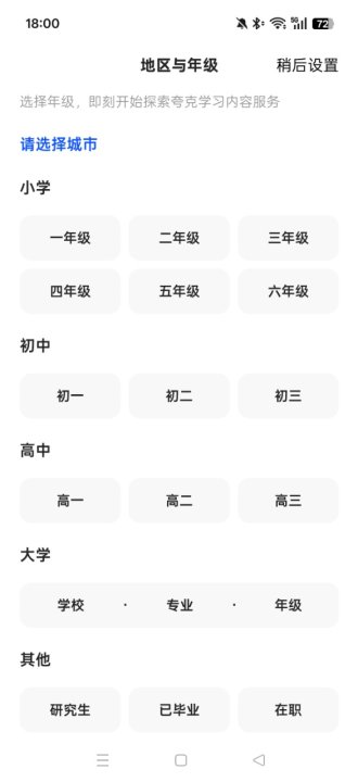 2、选择用户使用的所在地区和年级,点击稍后设置进入使用界面部分。