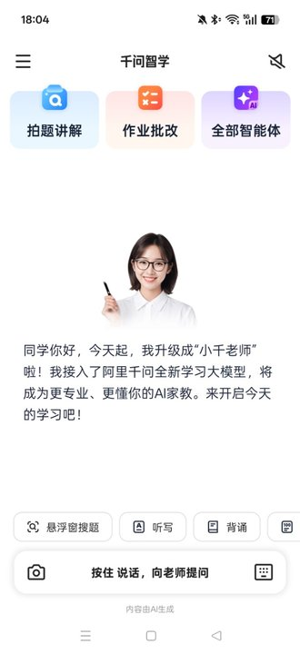《千问智学官方免费版下载》是阿里巴巴最新推出的AI类软件,为解决全国各省份城市的学生学习所推出,拥有深度解题、作业批改、古诗/课文背诵等几个主要版块,以虚拟AI老师小千的形式进行一对一的问答形式,帮助孩子们解决学习闪的困难,同时巩固自身学习记忆能力,更好的提升自我,在考试中发挥出更好。