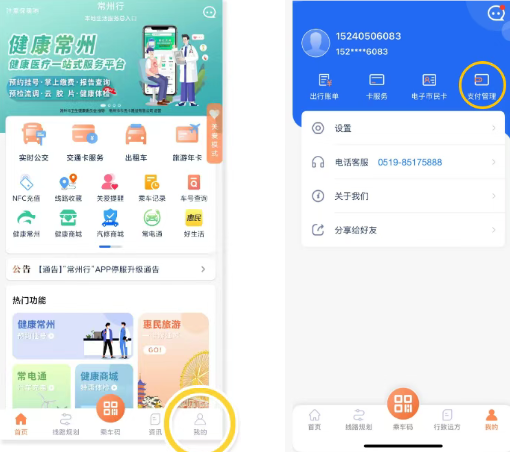 3、若未开通请按提示开通乘车码所需“金融钱包”或“数字人民币”钱包并充值即可展码。常州行APP首页,依次点击下方菜单栏【我的】-【支付管理】;