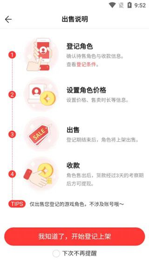 4、收款:角色售出后,货款经过3天的考察期后方可提现。
