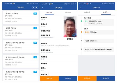 在访客管理中,用户可以查看所有访客信息,同时能够进行处理访客预约信息,包括同意访问和拒绝访问。