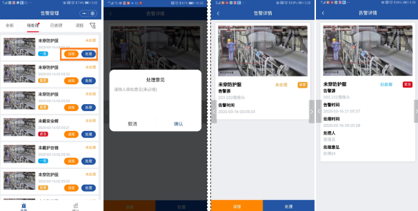 告警管理应用支持告警查询、告警处理、告警统计功能。在告警中,可查看告警的详细信息,同时可以处理告警信息;在统计中,可以按照日统计和月统计来查看告警数据分析。厂区内告警信息可实时同步数据到现场监控室告警大屏,云端信息也可以同步到安智通APP,方便用户随时随地查看管理。