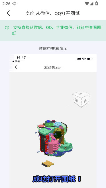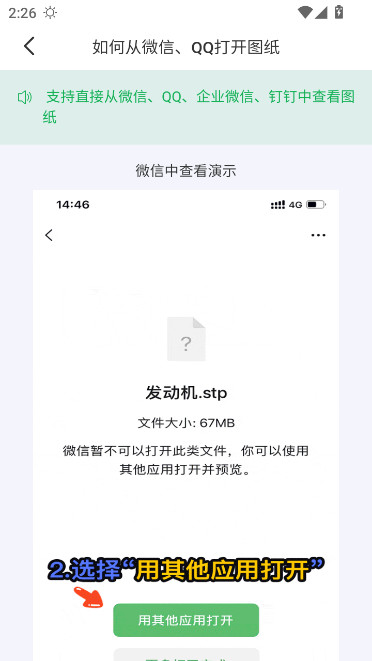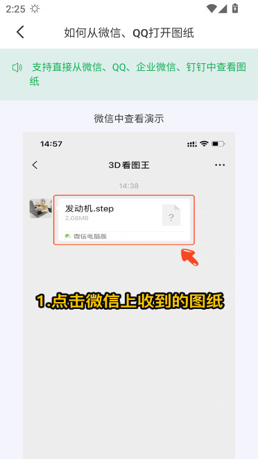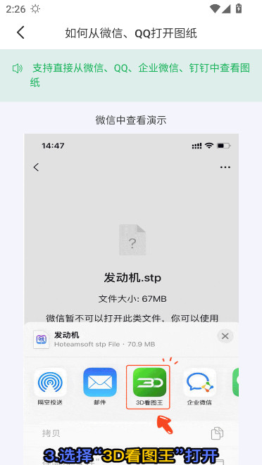 3D看图王支持直接从微信、QQ、企业微信、钉钉中查看图纸,手机端用户们可参照如下图示过程去操作,完成图纸打开的操作: