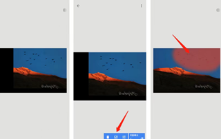调整完大小、位置以及叠加方式后点击√确定,依次点击屏幕右上角带箭头的图标、“查看修改内容”、右下角的“双重曝光”、弹出来的画笔图标。接下来用手指在飞鸟的位置进行一个涂抹,然后点击√确定,导出即可。