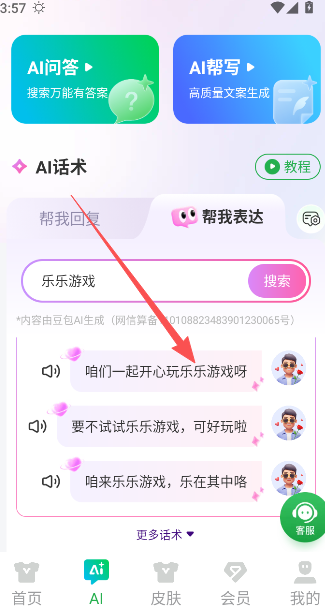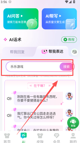 1、点击软件AI版块,选择帮我表达栏目,在内容区域内输入文字搜索。