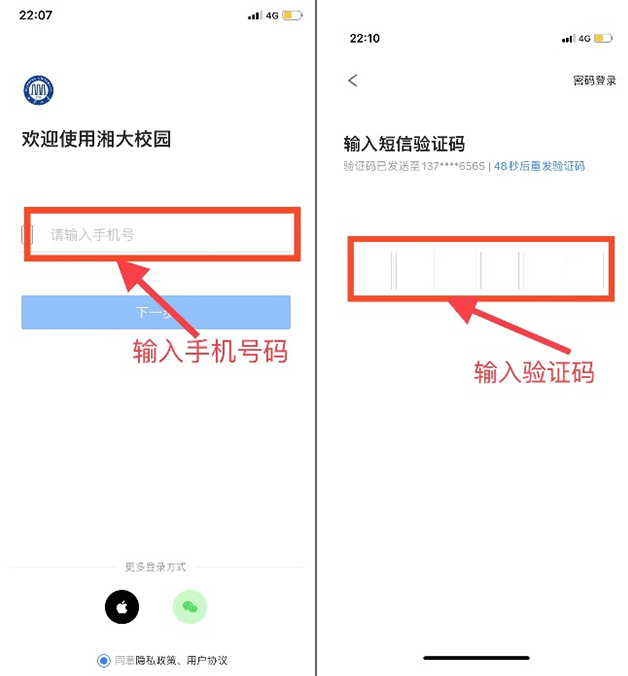 用户名请输入学号或者身份证号码(或8位数的职工号) ;密码请输入一卡通密码(一卡通初始密码是身份证号码最后六位数字,身份证最后一位有“x”,去掉“x”前推一位) 。后续按提示依次操作即可(输身份证号码、手机验证码等),其中还需设置一个登陆密码,便于以后APP重新登陆。注意,绑定银行卡仅限于建行湘大支行发出的银行卡。步骤如下列图所示: