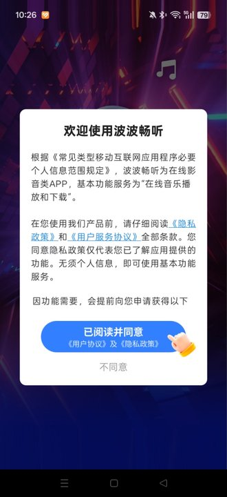 1、打开下载好的软件启动进入,完整阅读用户协议及隐私部分,点击已阅读并同意进入。