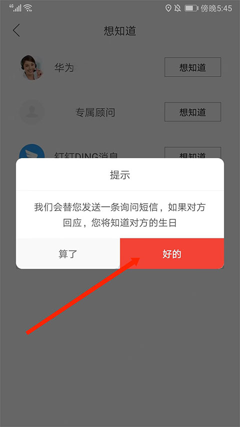 4、出现提示,然后选择“好的”,等待对方回复以后就能知道它的生日信息啦。