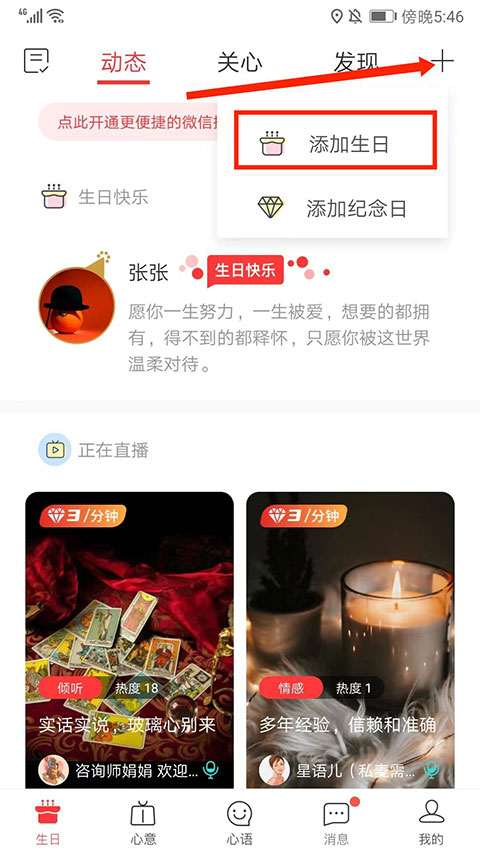 1、打开生日管家app,选择右上角“+号”图标,去往添加生日的界面。
