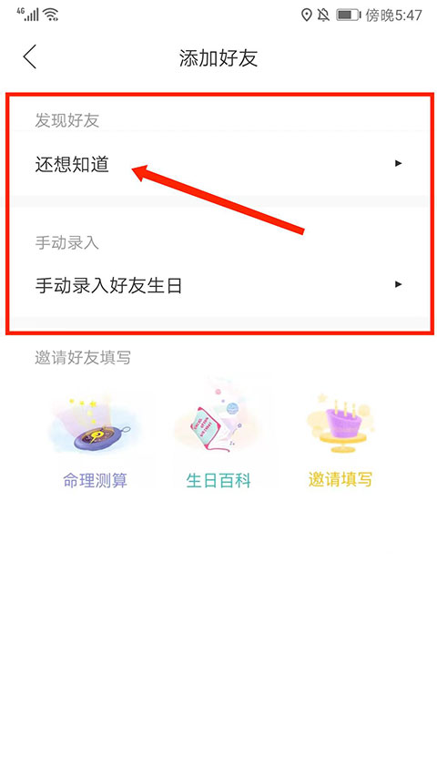 2、添加信息页分为发现好友和手动录入两个选项,点击添加你想要知道的好友信息。
