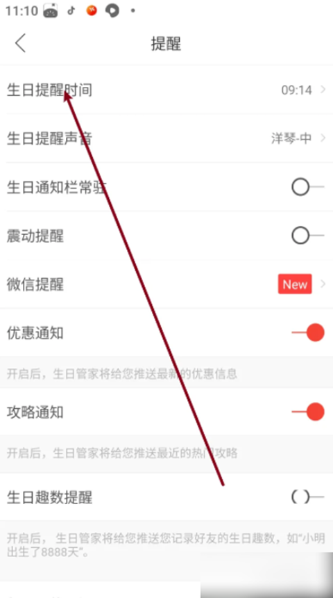 步骤三:在提醒设置中,找到“生日提醒时间”对你所要提醒的时间进行设置,同时还可以添加其他的个性化操作,保证到时间以后不会遗忘。