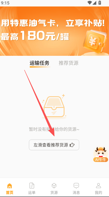4、来到首页界面以后,点击左滑动查看推荐货源。