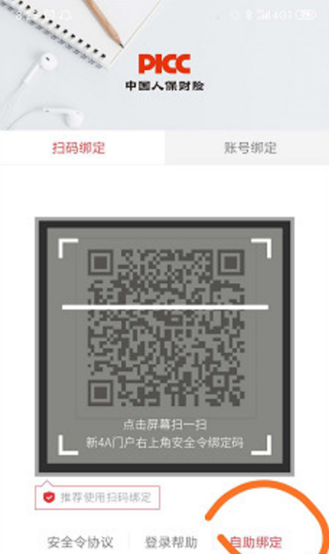 3、打开手机人保安全令APP,进行自助绑定