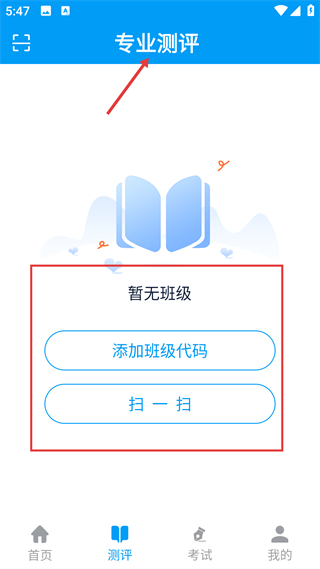 3、进入专业测评页面,若显示暂无班级,可通过添加班级代码或扫一扫这两个功能,关联对应的学习班级以便参与测评,大家平时做测试或是模拟考试都是在这里查测评结果。