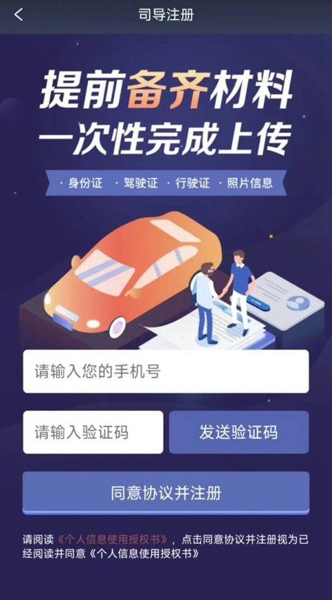 1、下载好APP后,点立即注册,提前备好(身份证驾驶证行驶证)照片。