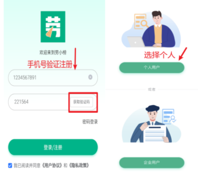 注:学生注册:使用手机号验证注册,选择个人用户。