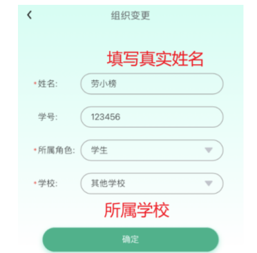 填写真实姓名、所属角色、所属学校进行“确定”操作。
